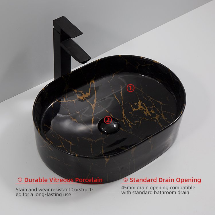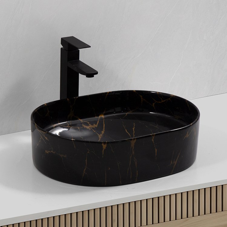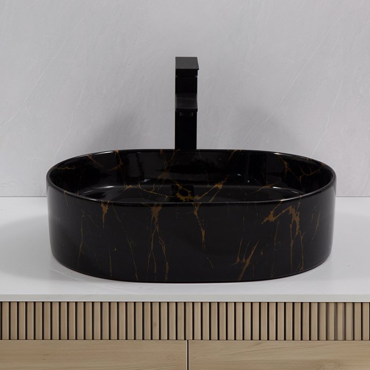Type: Modern multi-shape black marble-patterned ceramic basin (hand-finished vein texture) – compatible with dark walnut cabinets, black quartz vanities, or marble countertops, designed for seamless integration with luxury storage systems (e.g., built-in drawer modules, open shelving).
